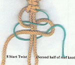 Step 8: Start twist. Hint: take knot out of the end of the cord. To make the knot twist you will tie only half a reef knot. The cord on the left-hand side will always go under the core. Continue until you are about 2 inches from the end of the loop…