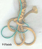 Step 9: Finish. Hint: We discovered the knot stays better if you are able to tuck the ends under the last 3 or 4 knots. To finish, loosen the last 3 or 4 knots. Then tuck the end of each cord under the knots (follow the core) leaving large loops near the end. Then retighten the knots around the core and the two ends you tucked. Then pull the ends until the loops, created when you started to tuck, are pulled tight to the base of the knot. Cut off ends.